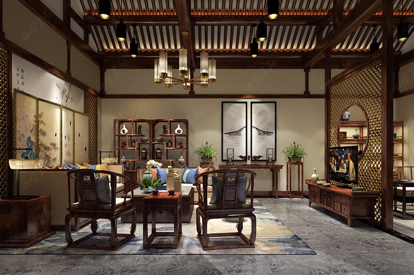 追尋往昔,我們不難發現,真正的生活應該和植物、山水、平和、文化結合在一起。設計師將這些概念寫入眾多裝飾元素:盆景、隔扇、山水畫、梁架、博古架、青瓷古玩,通過充滿匠心的布置合而為一,帶給人一種自然親切、古韻盎然的愜意體驗。